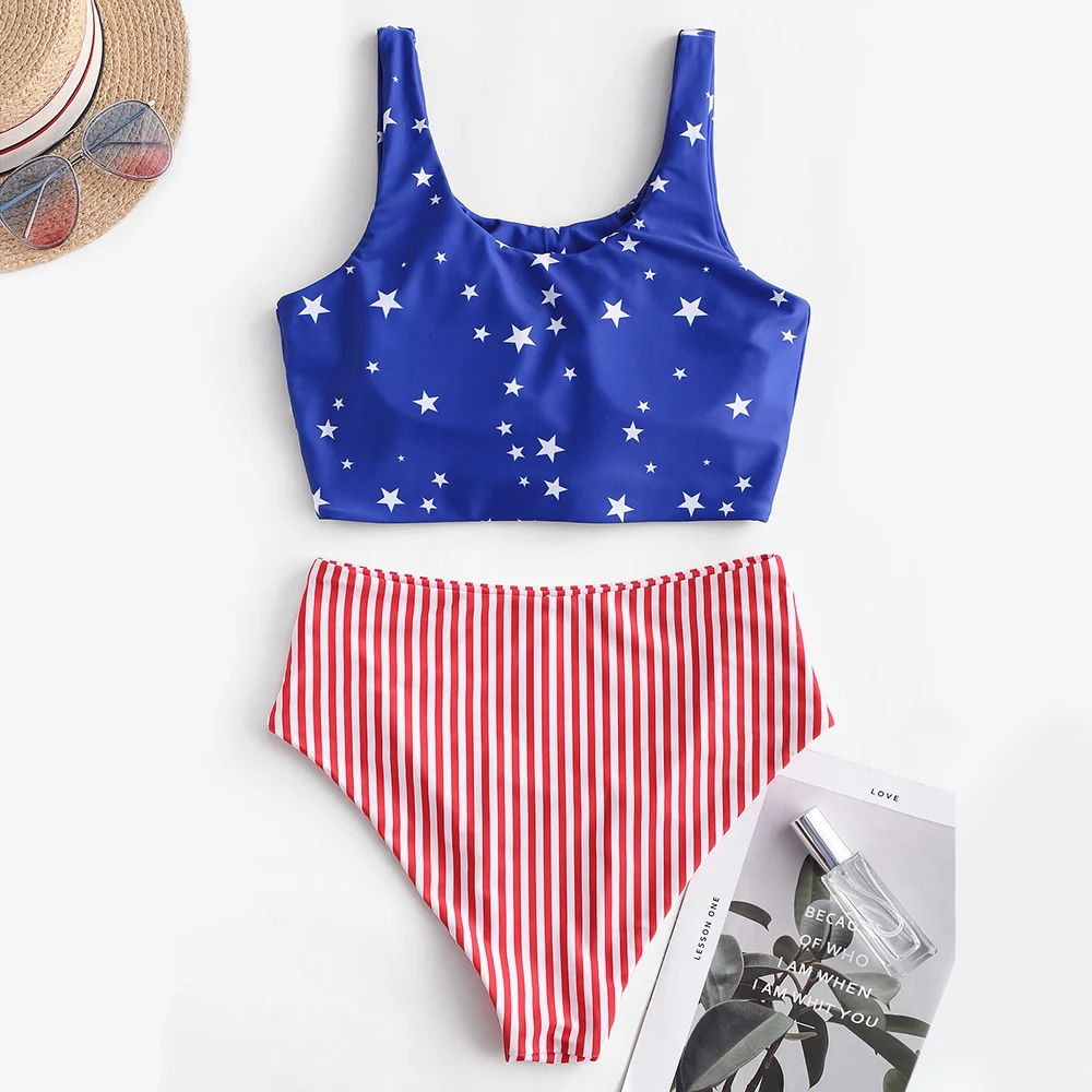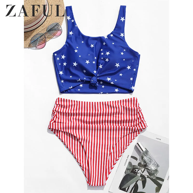 Good Offer for ZAFUL Bikini American Flag Tied Plunging Tankini Women Beach Swimwear Push Up High Waisted Bikini P